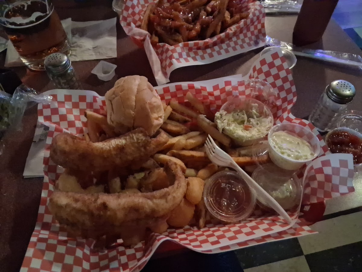 I got a really tasty burger and fries. Service and good were great. Started for some great karaoke after on a Saturday night. Our whole group had a great time.